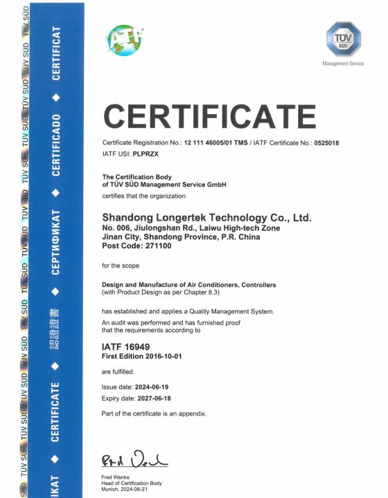 IATF16949汽車管理體系認證證書